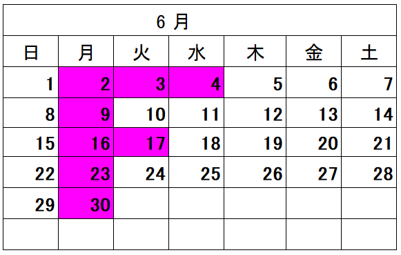 6月の営業カレンダーをお知らせいたします。ピンク色の日はお休みをいただきます。